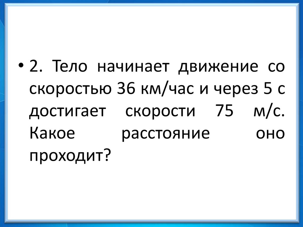 • 2. Тело начинает движение соскоростью 36 км/час и через 5 с
