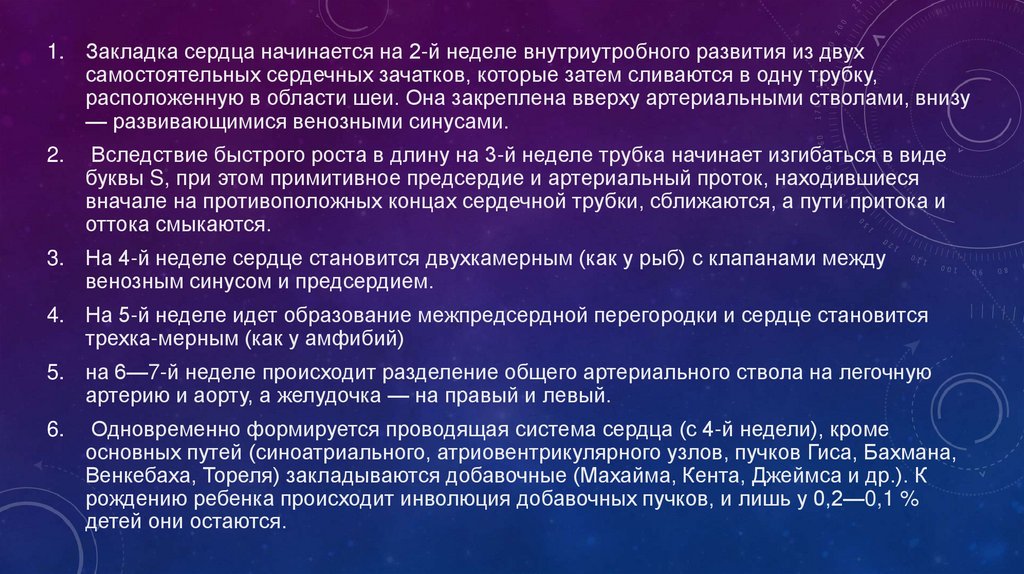 1. Закладка сердца начинается на 2-й неделе внутриутробного развития из двухсамостоятельных сердечных зачатков, которые затем сливаются в одну трубку,