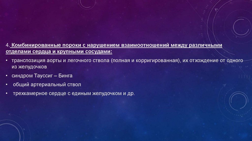 4. Комбинированные пороки с нарушением взаимоотношений между различнымиотделами сердца и крупными сосудами: