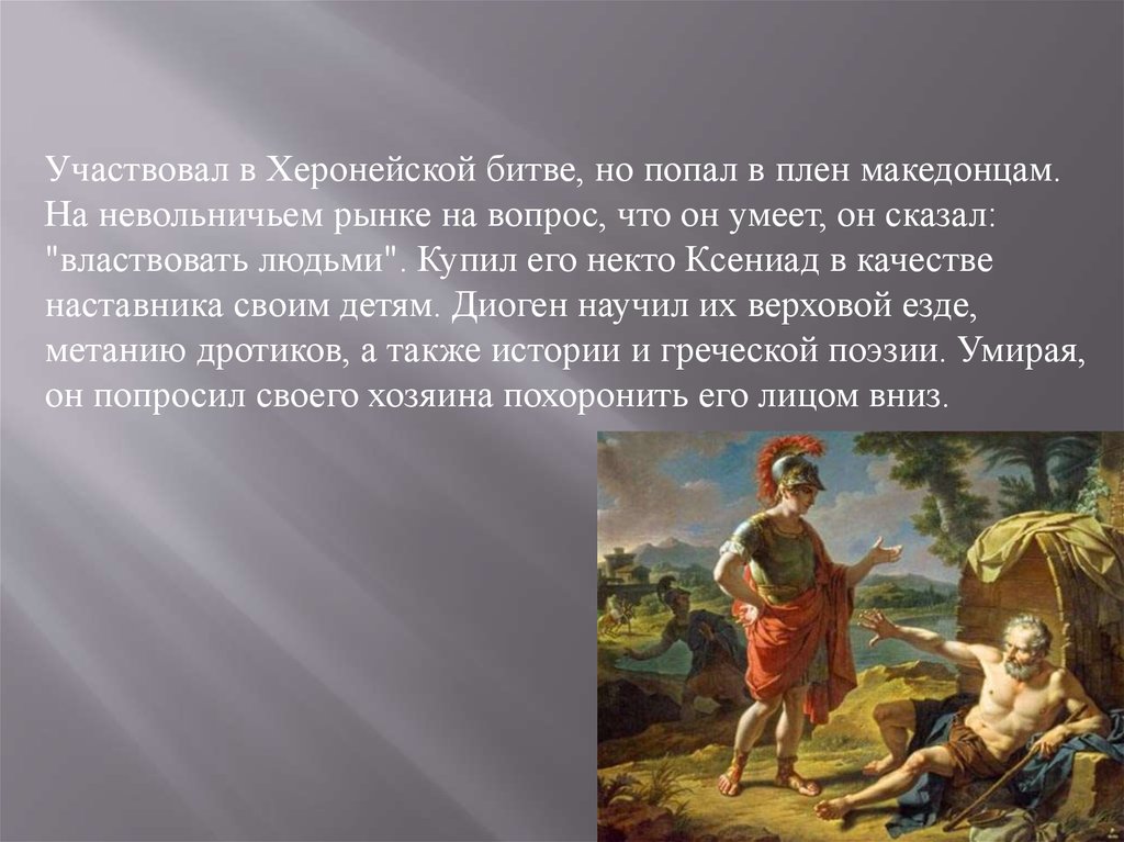 Участвовал в Херонейской битве, но попал в плен македонцам.На невольничьем рынке на вопрос, что он умеет, он сказал: