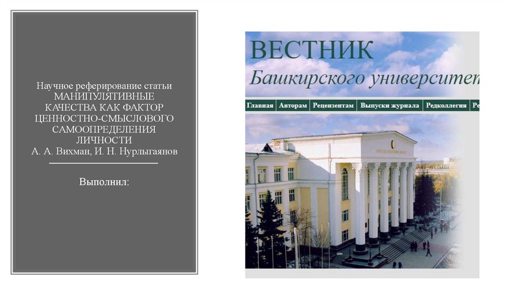 1. Научное реферирование статьи МАНИПУЛЯТИВНЫЕ КАЧЕСТВА КАК ФАКТОР ЦЕННОСТНО-СМЫСЛОВОГО САМООПРЕДЕЛЕНИЯ ЛИЧНОСТИ А. А. Вихман, И.
