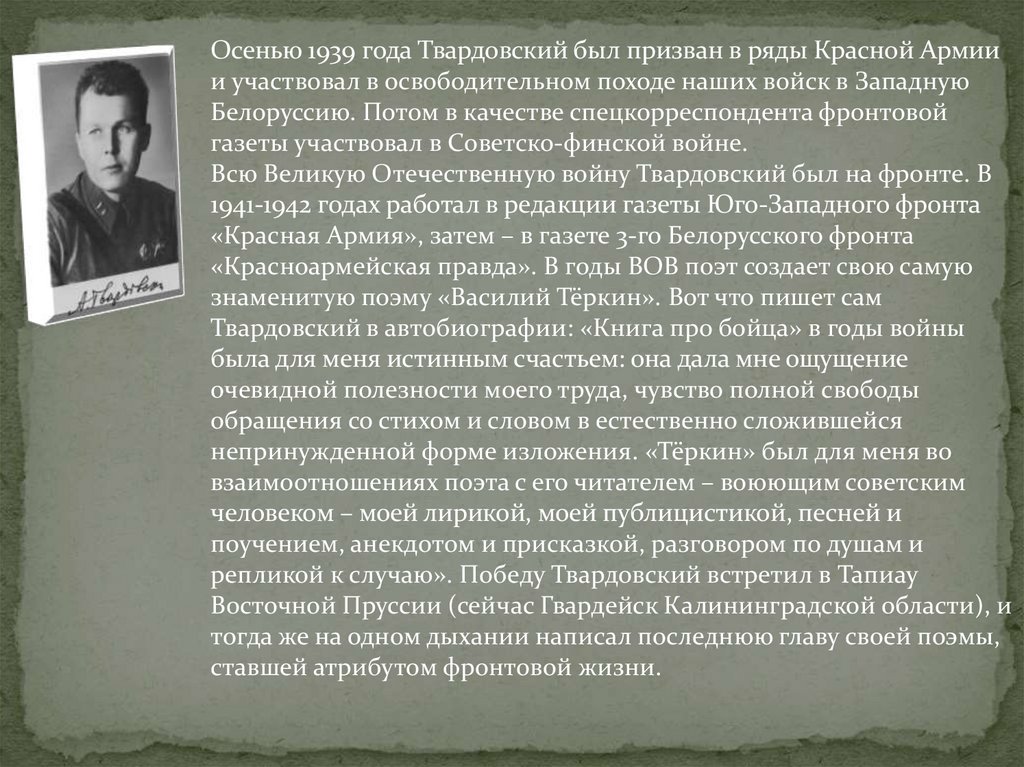 Осенью 1939 года Твардовский был призван в ряды Красной Армиии участвовал в освободительном походе наших войск в Западную