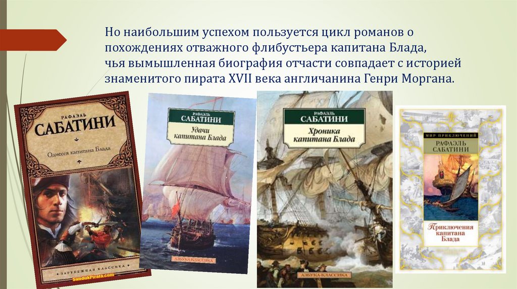 Но наибольшим успехом пользуется цикл романов опохождениях отважного флибустьера капитана Блада,