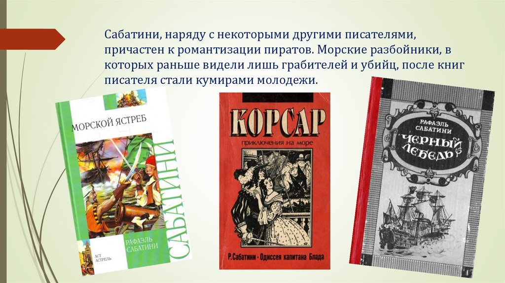 Сабатини, наряду с некоторыми другими писателями,причастен к романтизации пиратов. Морские разбойники, в