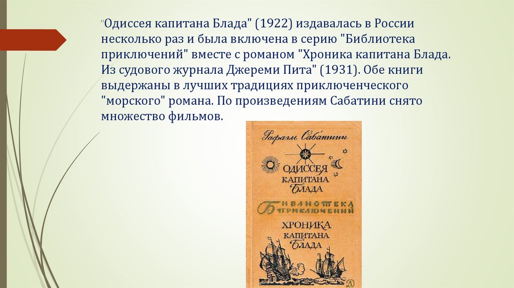 "Одиссея капитана Блада" (1922) издавалась в Россиинесколько раз и была включена в серию "Библиотека