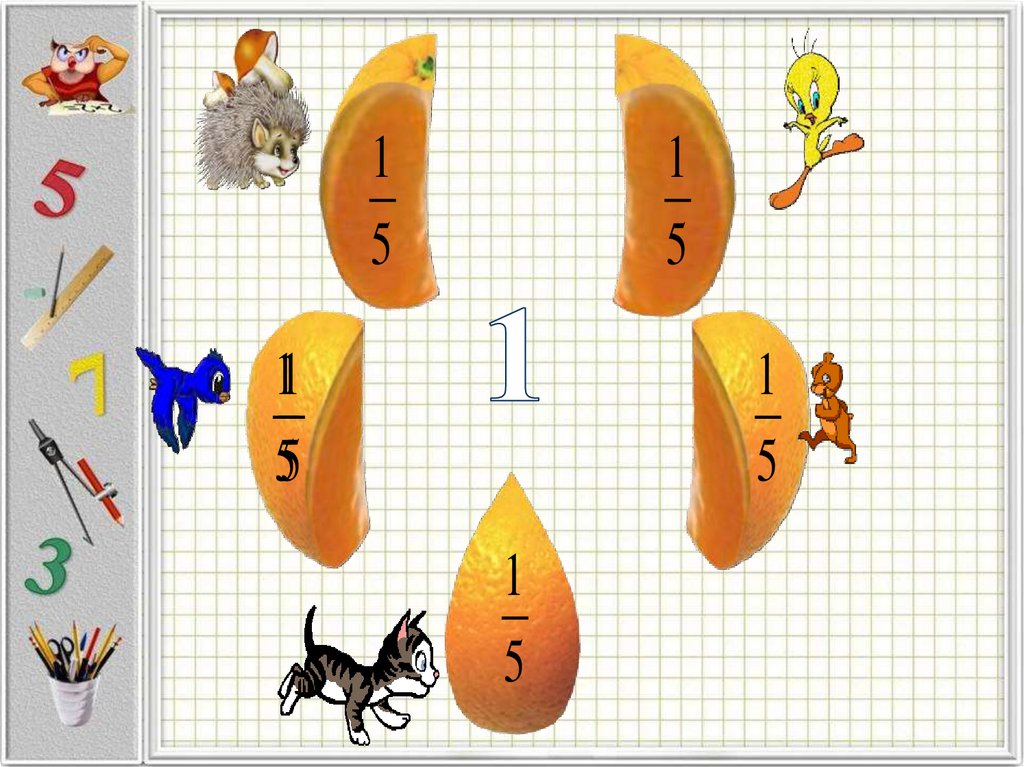 Эти равные части называют долями.Так как апельсин разделили на 5 равных