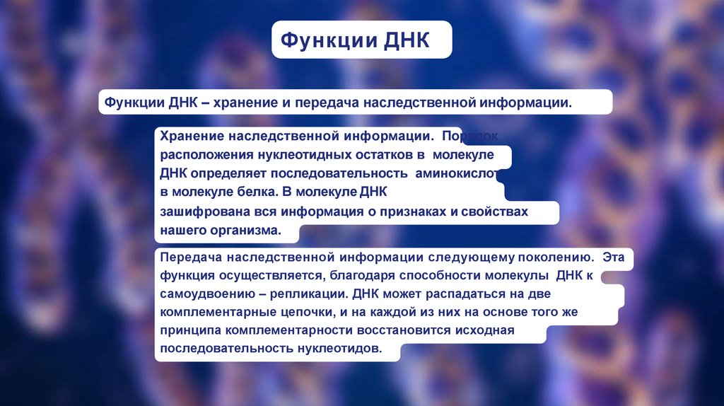 Функции ДНКФункции ДНК – хранение и передача наследственной информации.