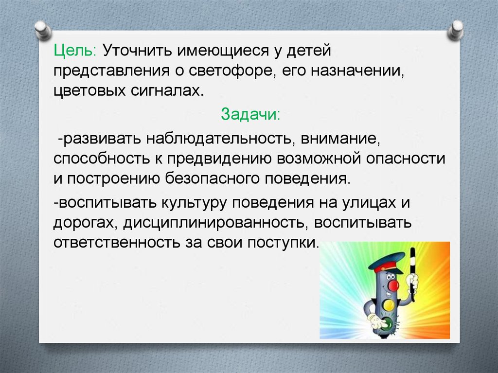 Цель: Уточнить имеющиеся у детейпредставления о светофоре, его назначении,