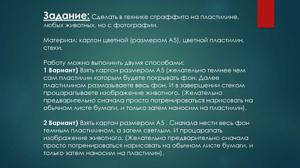 Задание: Сделать в технике сграффито на пластилине,любых животных, но с фотографии.