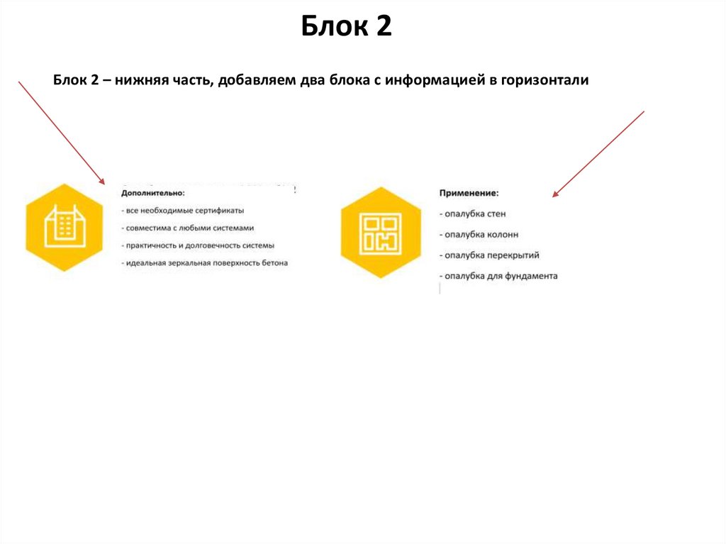 Блок 2Блок 2 – нижняя часть, добавляем два блока с информацией в горизонтали