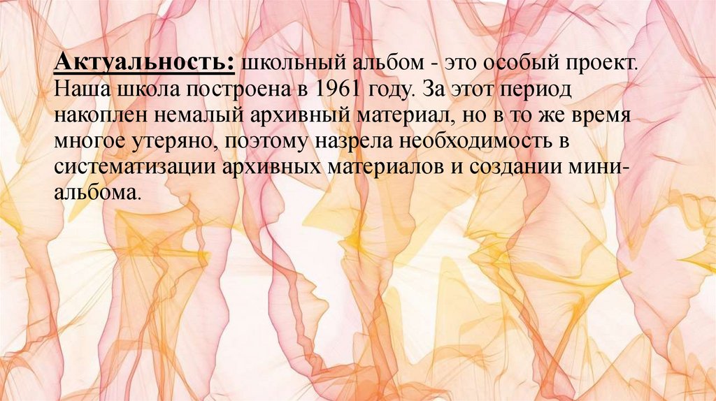 Актуальность: школьный альбом - это особый проект.Наша школа построена в 1961 году. За этот период
