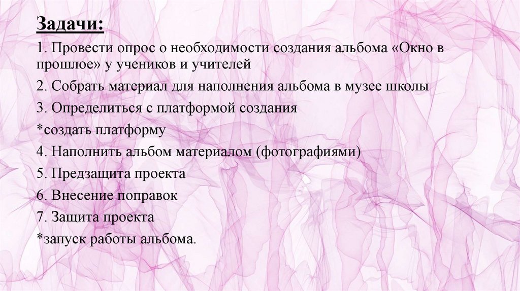 Задачи:1. Провести опрос о необходимости создания альбома «Окно в