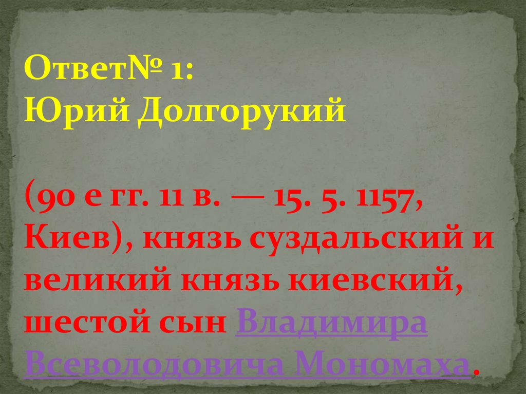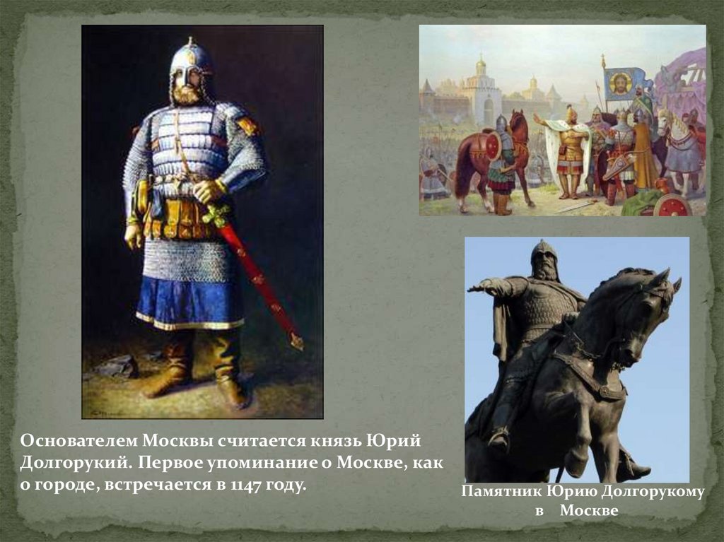 Основателем Москвы считается князь ЮрийДолгорукий. Первое упоминание о Москве, как