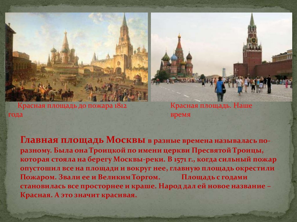 Главная площадь Москвы в разные времена называлась поразному. Была она Троицкой по имени церкви Пресвятой Троицы,