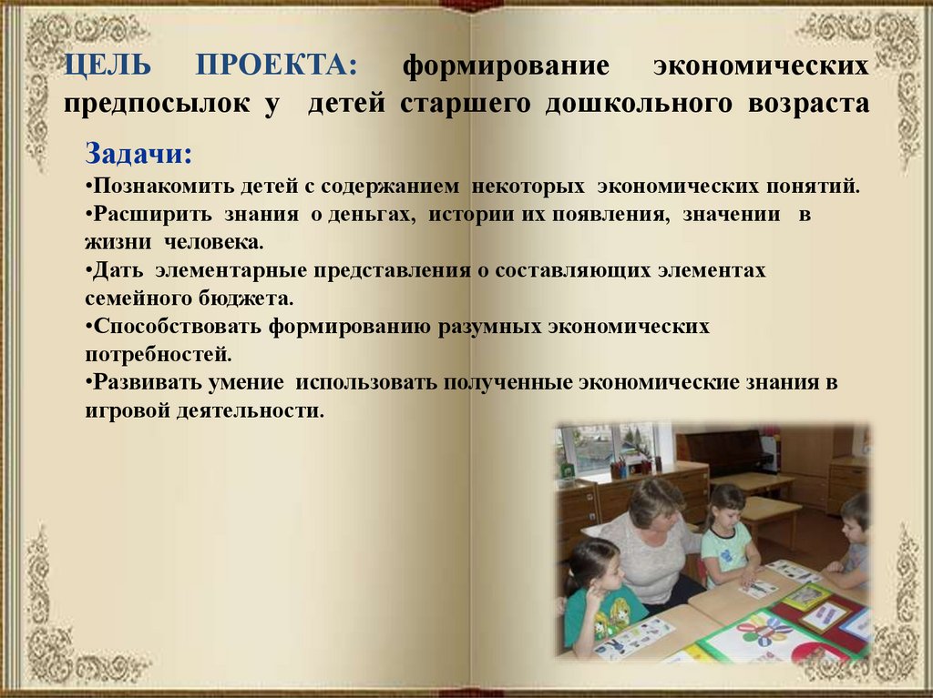 ЦЕЛЬ ПРОЕКТА: формирование экономическихпредпосылок у детей старшего дошкольного возраста