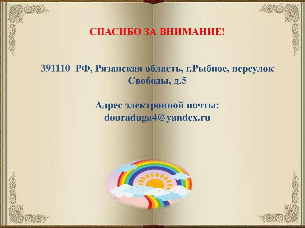 СПАСИБО ЗА ВНИМАНИЕ!391110 РФ, Рязанская область, г.Рыбное, переулок