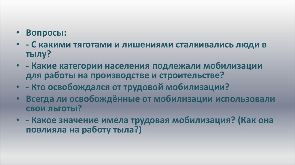 • Вопросы:• - С какими тяготами и лишениями сталкивались люди в