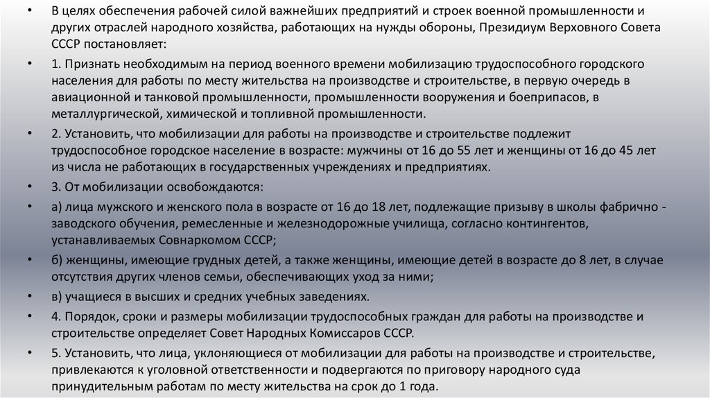 В целях обеспечения рабочей силой важнейших предприятий и строек военной промышленности и