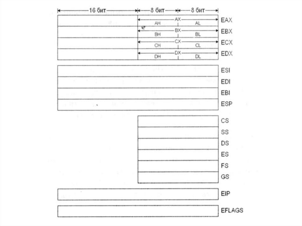 • EAX – основной арифметический регистр• EBX – предназначен для хранения