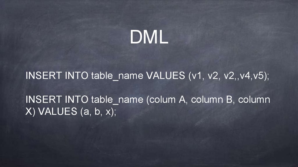 DMLINSERT INTO table_name VALUES (v1, v2, v2,,v4,v5);