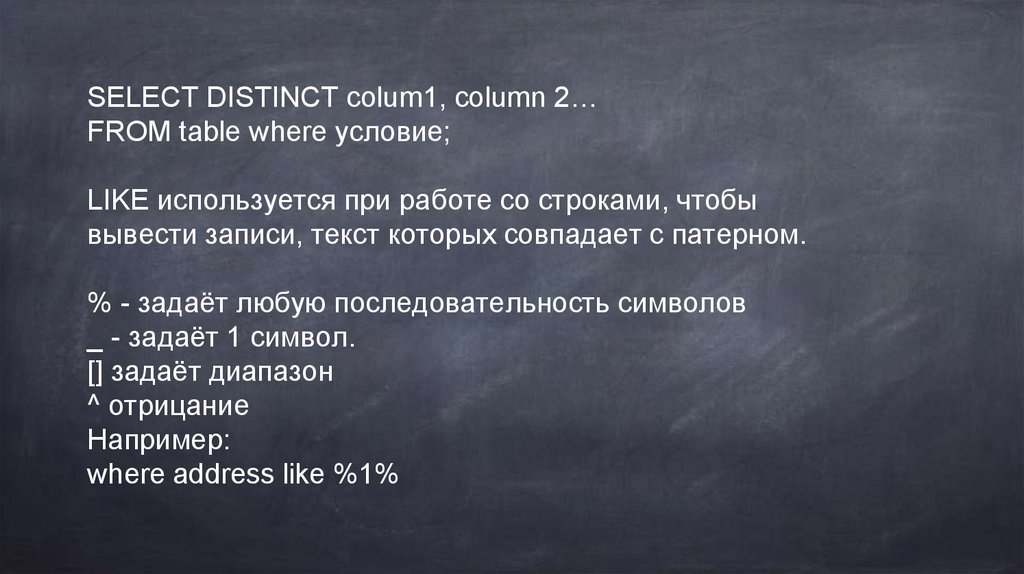 SELECT DISTINCT colum1, column 2…FROM table where условие;