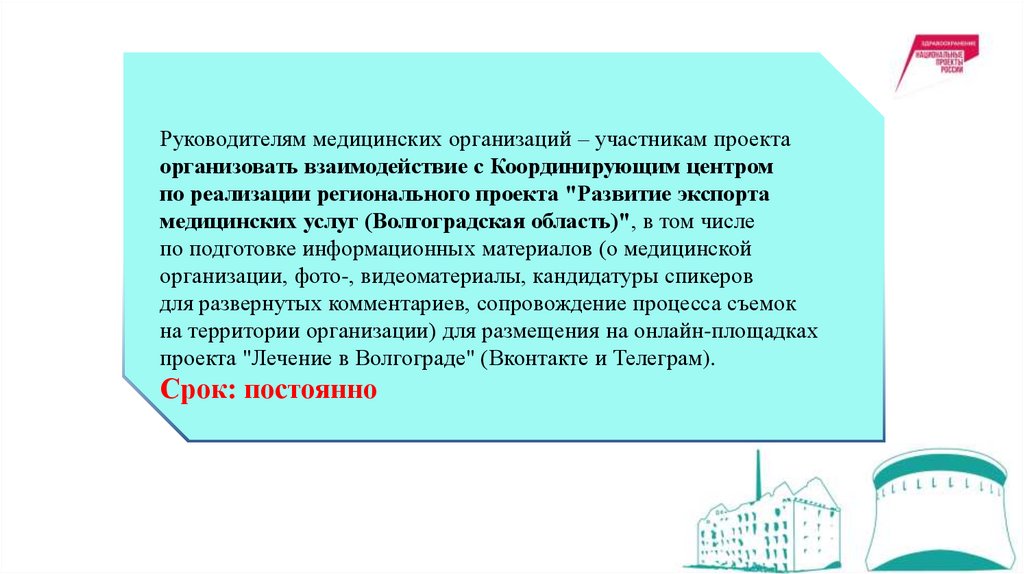 Руководителям медицинских организаций – участникам проектаорганизовать взаимодействие с Координирующим центром