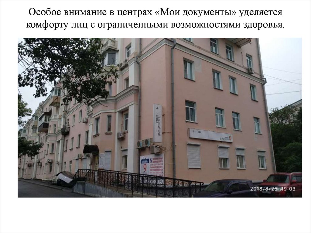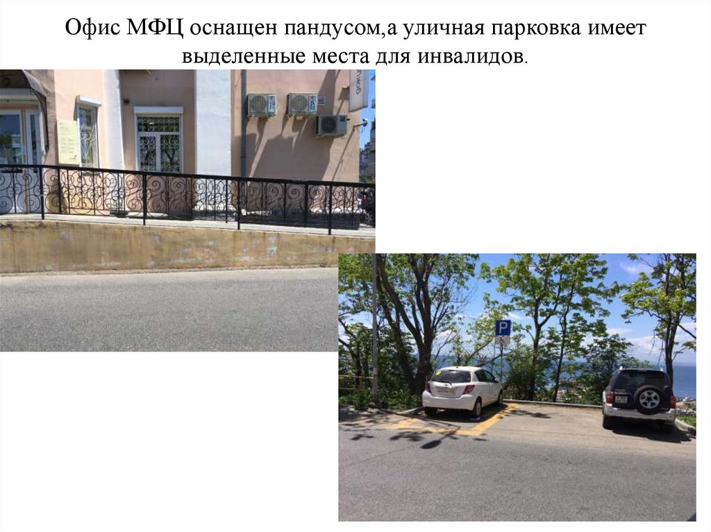 Офис МФЦ оснащен пандусом,а уличная парковка имеетвыделенные места для инвалидов.
