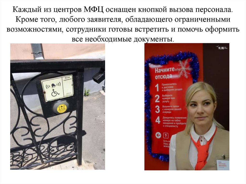 Каждый из центров МФЦ оснащен кнопкой вызова персонала.Кроме того, любого заявителя, обладающего ограниченными