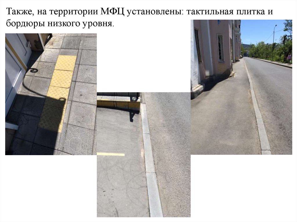 Также, на территории МФЦ установлены: тактильная плитка ибордюры низкого уровня.