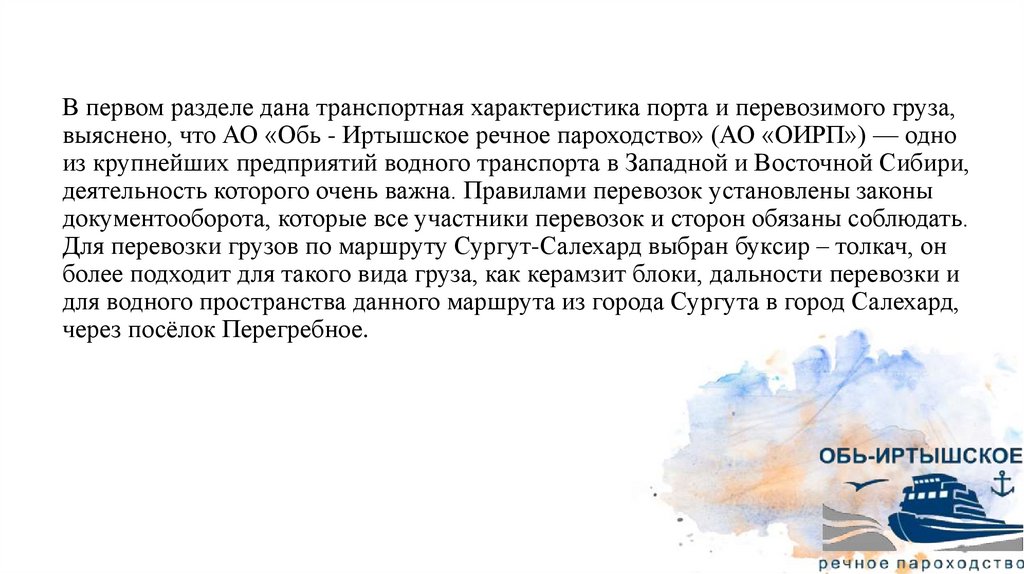 В первом разделе дана транспортная характеристика порта и перевозимого груза,выяснено, что АО «Обь - Иртышское речное пароходство» (АО «ОИРП») — одно