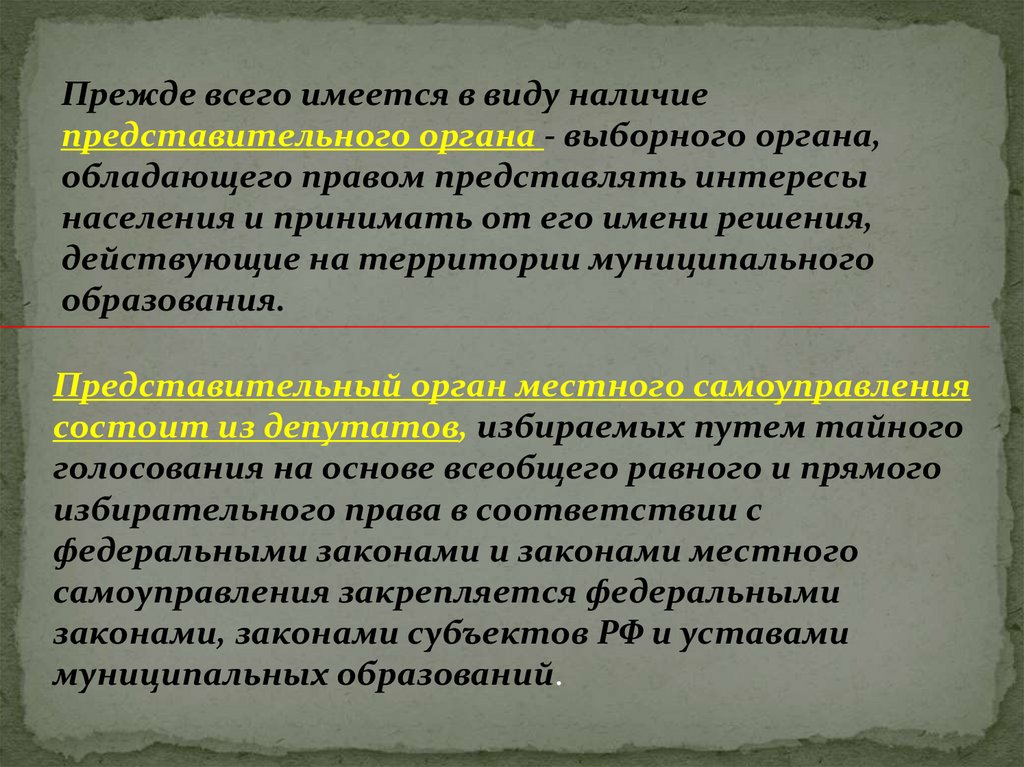 Прежде всего имеется в виду наличиепредставительного органа - выборного органа,