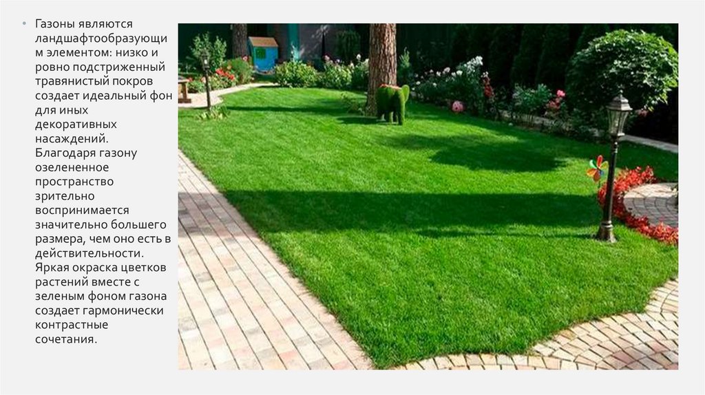 9. Газоны оказывают оздоровительное и санитарно-гигиеническое воздействие. Зеленый цвет способствует восстанавлению работы нервной