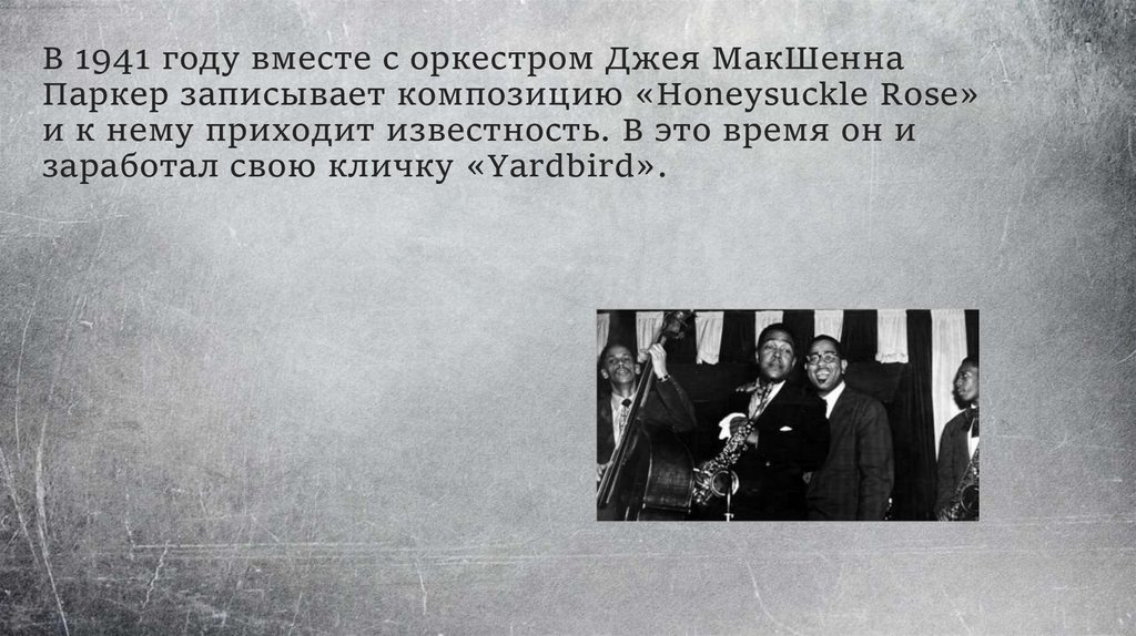 В 1941 году вместе с оркестром Джея МакШеннаПаркер записывает композицию «Honeysuckle Rose»