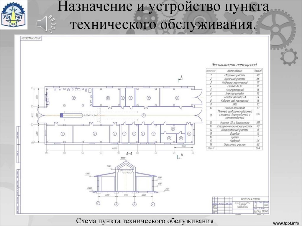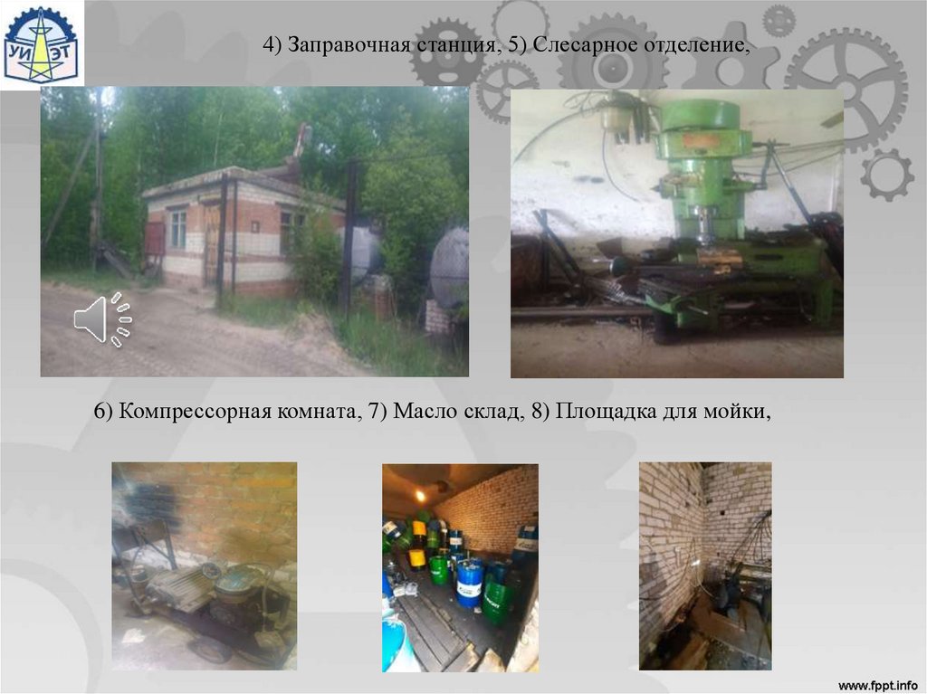 4) Заправочная станция, 5) Слесарное отделение,6) Компрессорная комната, 7) Масло склад, 8) Площадка для мойки,