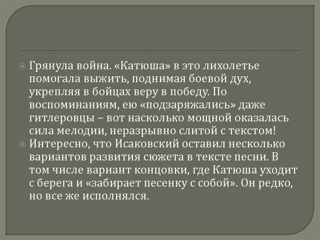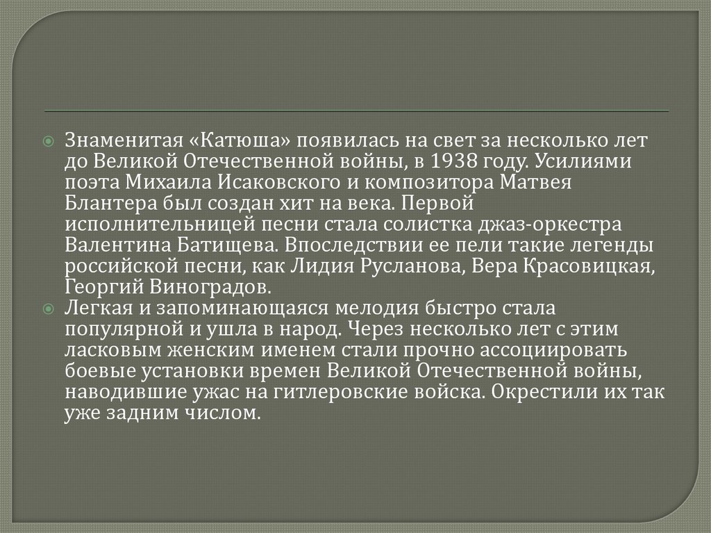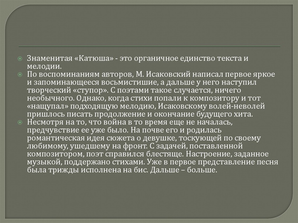 Знаменитая «Катюша» - это органичное единство текста имелодии.