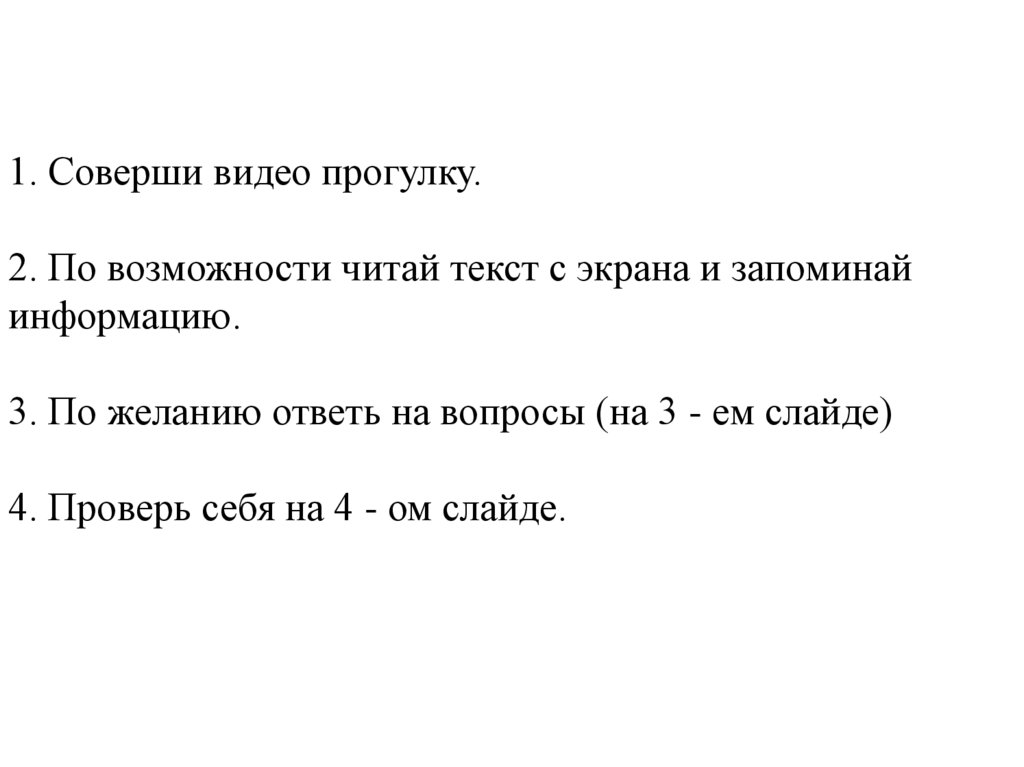 1. Соверши видео прогулку.2. По возможности читай текст с экрана и запоминай