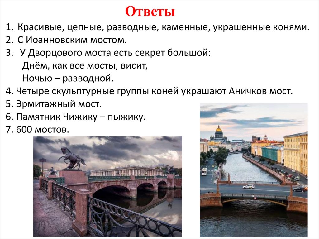 Ответы1. Красивые, цепные, разводные, каменные, украшенные конями.