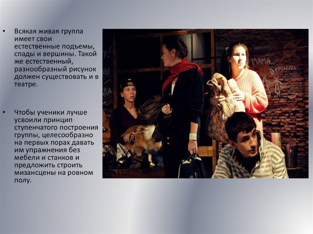 5. Каждая мизансцена должна быть психологически оправдана актёрами, возникать естественно, непринуждённо и органично.