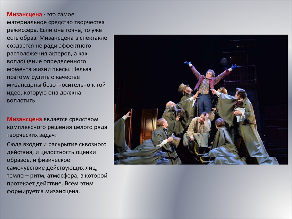 Мизансцена – это пластический и звуковойобраз, в центре которого находится живой,