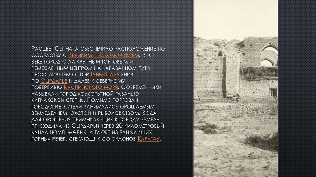 РАСЦВЕТ СЫГНАКА ОБЕСПЕЧИЛО РАСПОЛОЖЕНИЕ ПОСОСЕДСТВУ С ВЕЛИКИМ ШЁЛКОВЫМ ПУТЁМ. В XII