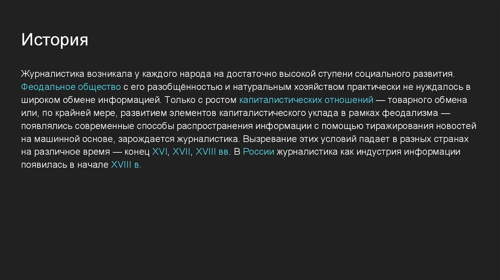 на различное время — конец XVI, XVII, XVIII вв. В России журналистика как индустрия информации