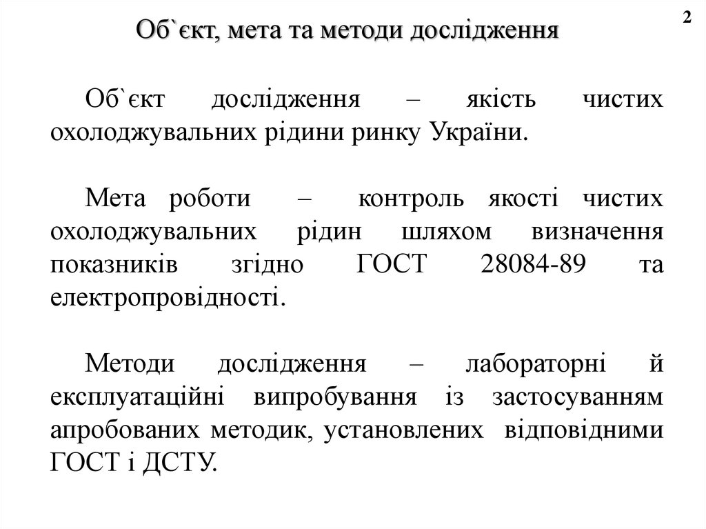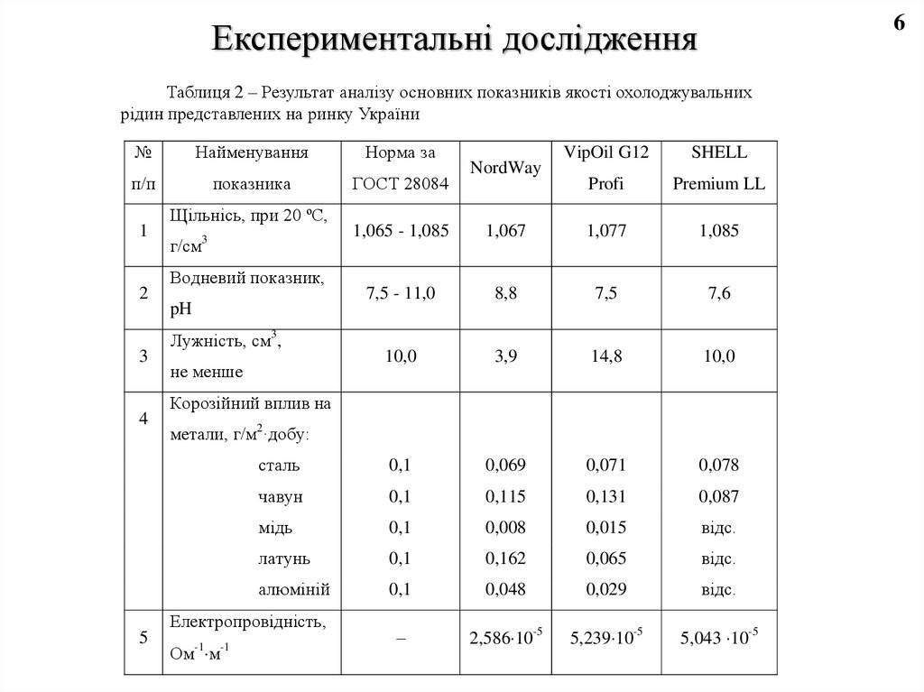 Таблиця 2 – Результат аналізу основних показників якості охолоджувальних