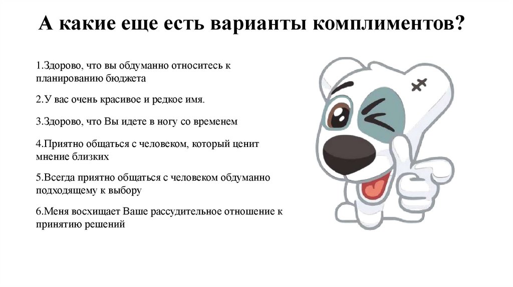 А какие еще есть варианты комплиментов?1.Здорово, что вы обдуманно относитесь к