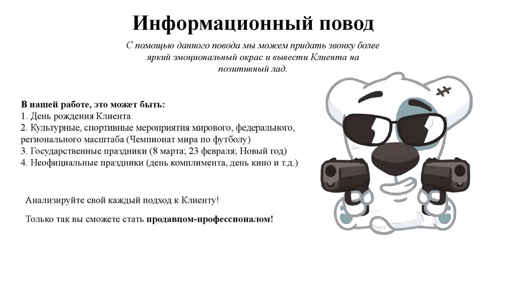 Информационный поводС помощью данного повода мы можем придать звонку более
