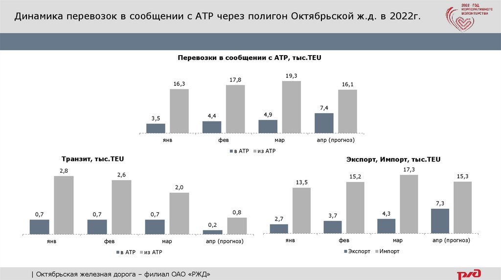Динамика перевозок в сообщении с АТР через полигон Октябрьской ж.д. в 2022г.Перевозки в сообщении с АТР, тыс.TEU
