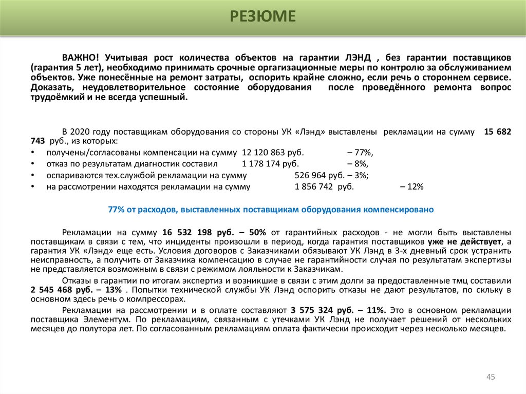 В 2020 году поставщикам оборудования со стороны УК «Лэнд» выставлены рекламации на сумму 15 682