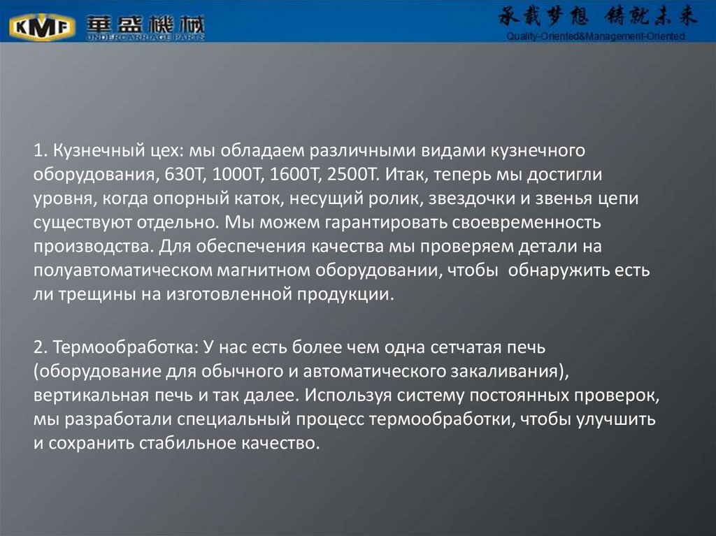 1. Кузнечный цех: мы обладаем различными видами кузнечногооборудования, 630T, 1000T, 1600T, 2500T. Итак, теперь мы достигли