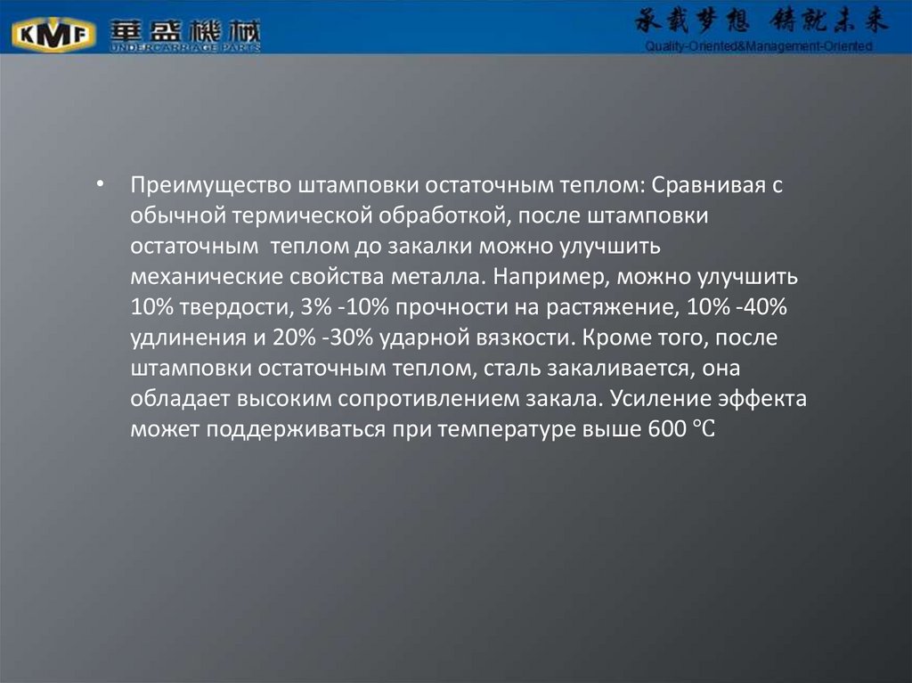 ● KMF: Мы используем температуру штамповки напрямую от нагревадо закалки, и заканчиваем штамповку, используя эту же температуру ,не