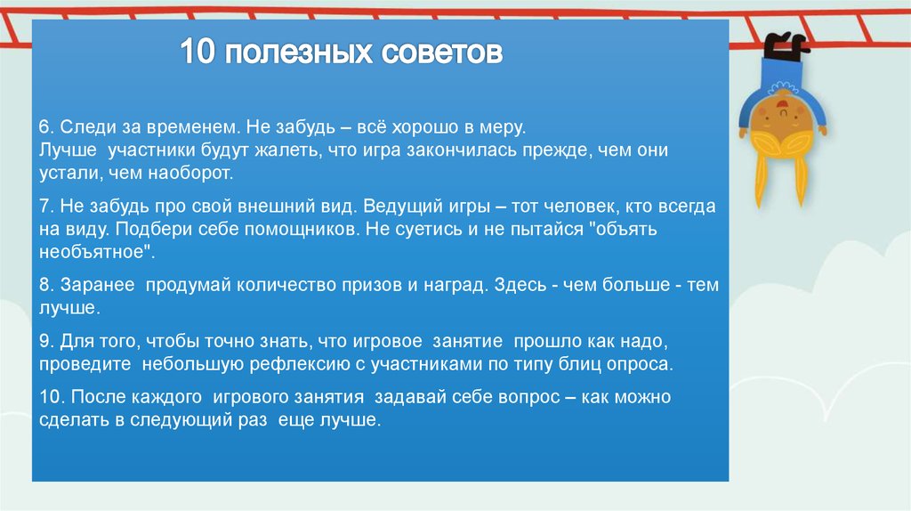 6. Следи за временем. Не забудь – всё хорошо в меру.Лучше участники будут жалеть, что игра закончилась прежде, чем они