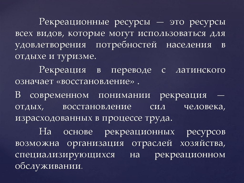 Рекреационные ресурсы — это ресурсывсех видов, которые могут использоваться для